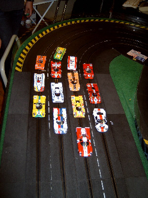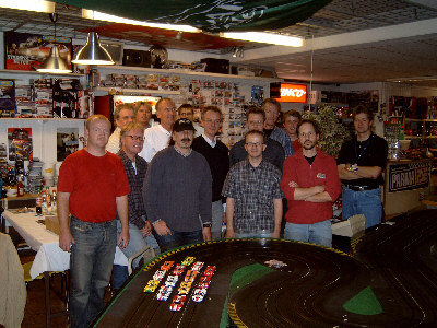 Im ersten Lauf geht’s gleich zur Sache. Auf Spur 1 und 2 liefern sich Piet und Walter einen knallharten Fight: beide ohne Fahrfehler und mit Rundenzeiten strikt unter 7,9. Selbst die Bestzeiten unterscheiden sich mit 7,640 (Piet) und 7,641 (Walter) nur um 1/1000 sec. Piet kann gerade einmal 1,2 sec herausfahren und beendet den ersten Lauf als Führender. Karl verliert ca. eine Runde auf Walter. Allein Käthe kann das Tempo auf Spur 3 nicht ganz halten und verliert nach einigen Abflügen den Anschluss. Im zweiten Lauf fahren Walter und Karl fehlerfrei. Piet dagegen leistet sich gleich mehrere kapitale Fahrfehler und fällt ca. ½ Runde hinter Karl auf den 3. Platz zurück. Walter leistet sich in den Läufen 3 und 4 keinen Fehler mehr und fährt den Sieg ungefährdet nach Hause. Tante Käthe hingegen wird von Schleifer-/Kontaktproblemen geplagt und fällt deutlich zurück. Im Endresultat reicht es gerade noch für Platz 10. Piet und Karl allerdings liefern sich buchstäblich bis zur letzten Runde einen heißen Kampf um Platz 2. Bis auf 1 m herangekommen flog Piet in der vorletzten Runde ab. Damit schien alles klar. Doch wie sehr Karls Nerven strapaziert waren zeigte sich, als er kurz nach Piets Missgeschick in der letzten Runde ebenfalls den Grünstreifen aufsuchte. Am Ende konnte er seinen 2 Platz mit gerade einmal 3 Metern bzw 0,48 sec bei der letzten Ziedurchfahrt retten.