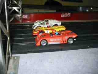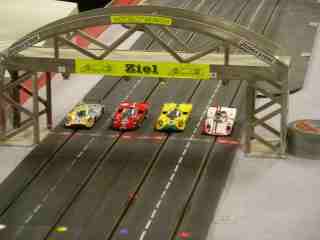 Während Artur Hollerith mit seiner schönen grünen Lola liebäugelte, weihte Artur Huber seinen Porsche 908 Flunder in die Geheimnisse der HotSlot-Bahn ein. Eigenem Bekunden nach muss Lola-Artur no a bisserl an der Dame feilen ... ist normal bei den Mädels, weisst Du doch ;-) Der flache 908er musste unter Arturs fordernder Hand gleich mal ordentlich Flagge zeigen, mit Herumzicken ist da nicht, da winkt Artur nämlich gleich mit seinem bewährten 908/3. Wie mittlerweile schon fast gewohnt, fanden sich auch diese beiden Herren in unmittelbarer Nachbarschaft der Ergebnisliste wieder.