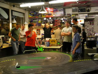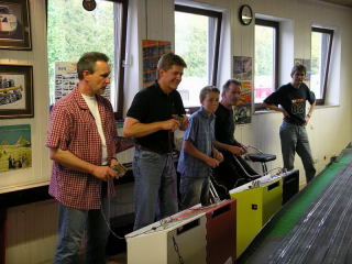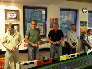 - Andre leistete sich einen Abflug zu viel (es waren eh so wenig), der ihm in seiner beispiellosen Aufholjagd leider zum Verhängnis wurde, dem Dietmar musste er mit hauchdünnem Vorsprung den Sieg lassen. Ich habe Didi noch nie so schweissnass gesehen, er hat den Regler aber auch wirklich ausgequetscht, denn Andre kam von hinten auf der schnelleren Spur herangeflogen, während Dietmar sich auf der Spur 4 abquälen musste. Drei Runden mehr oder ein Schlenker zuviel und das wäre es gewesen.