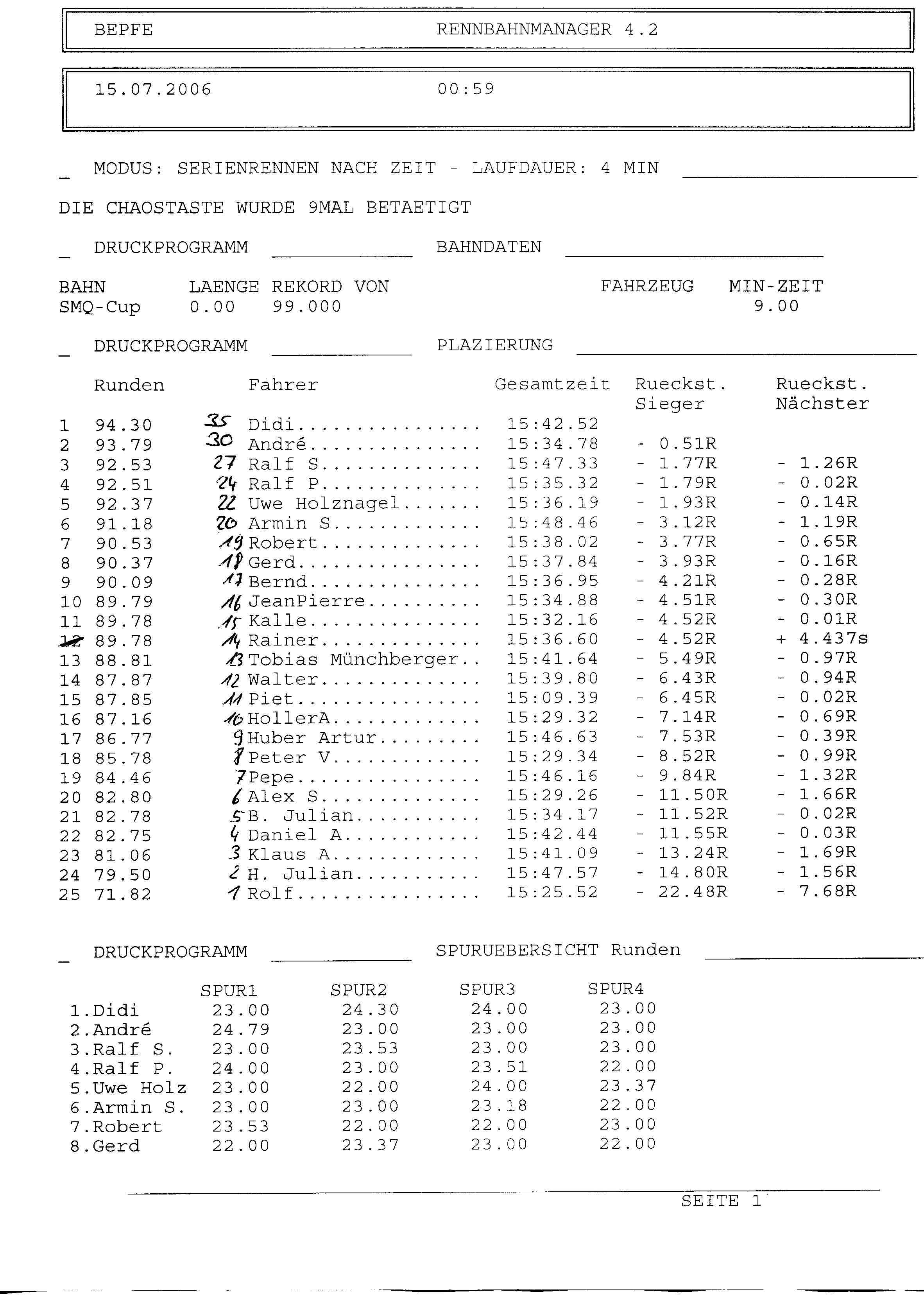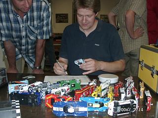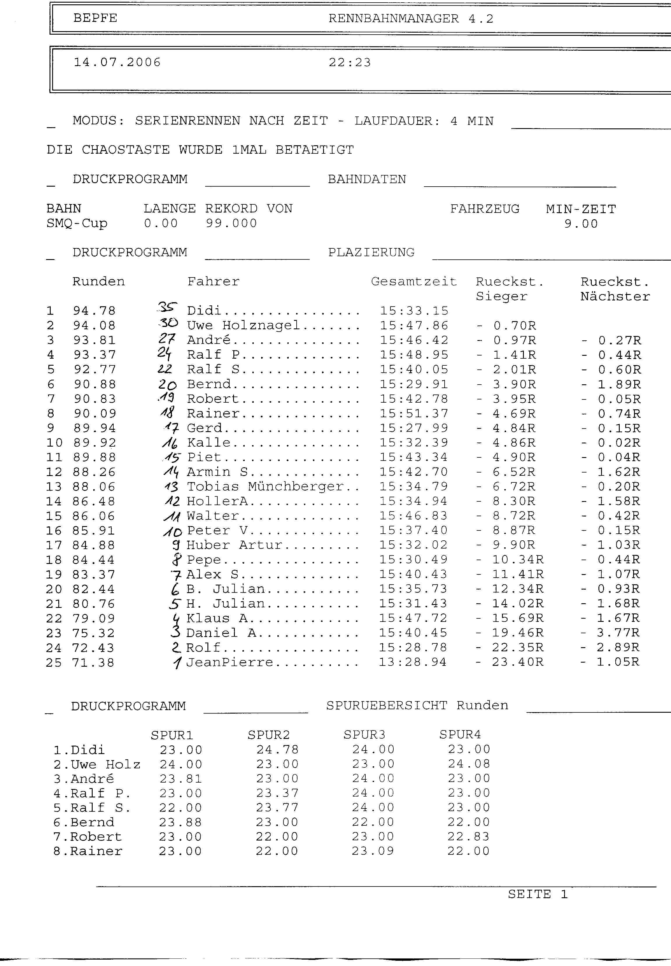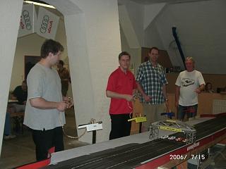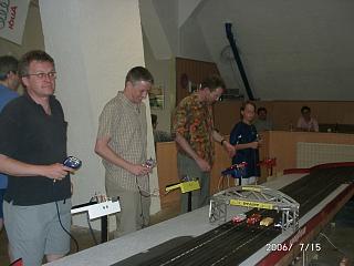 Einige Fahrer haben nach ersten weniger erfolgreichen Teilnahmen ein wenig mutlos die Segel gestrichen. Jungs, laßt Euch nicht entmutigen, wir haben hier einige sehr gute Autobauer, die ihr Autos gerne herleihen. Oder schaut mal wieder an den Abenden vorbei, wenn wir mit gestellten Autos fahren. Da muss jeder mit dem gleichen Material zurecht kommen. Und keine Angst, keiner von uns SMQ-Jungs wird sein Auto in der letzten Runde noch schnell verheizen, damit der Nachfolger eine Krücke vorfindet. Dafür kennen wir uns alle zu gut und dafür lege ich auch meine Hand ins Feuer.