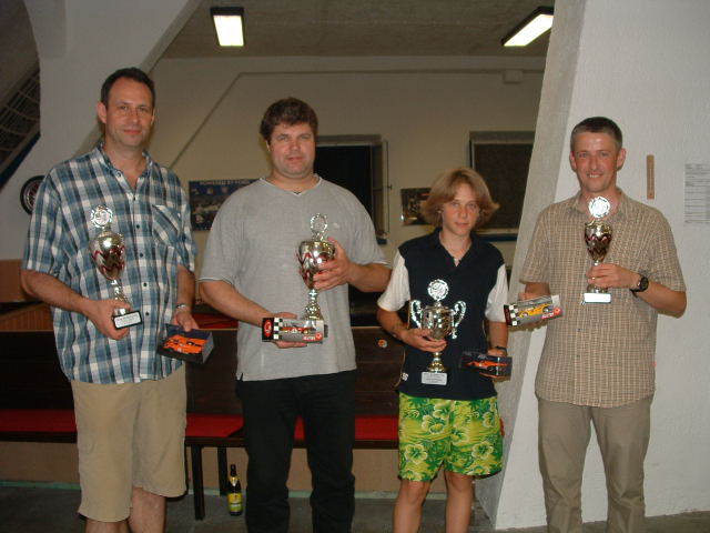 - Als erster bekennender "Nicht-GT40-Fahrer" konnte Karl mit fast 100 Punkten Rückstand zu den beiden Siegern seine dritte Position, die er vor diesem letzten Lauf hatte, knapp verteidigen. Uwe hatte nämlich im letzten Lauf nochmals a bisserl Zunder in seinen GT40 gepackt und wollte Karl diesen eigentlich sicher geglaubten Platz streitig machen. Mit einem zweiten Platz im ersten Rennen zwischen Didi und Andre war seine Marschrichtung auch dem letzten Teilnehmer klar. Im zweiten Rennen konnte er diesen Erfolg nicht wiederholen und musste sich so hinter Karl einreihen, der diesen verdienten Platz auf dem Stockerl mit einem Chevron im letzten Lauf untermauerte.